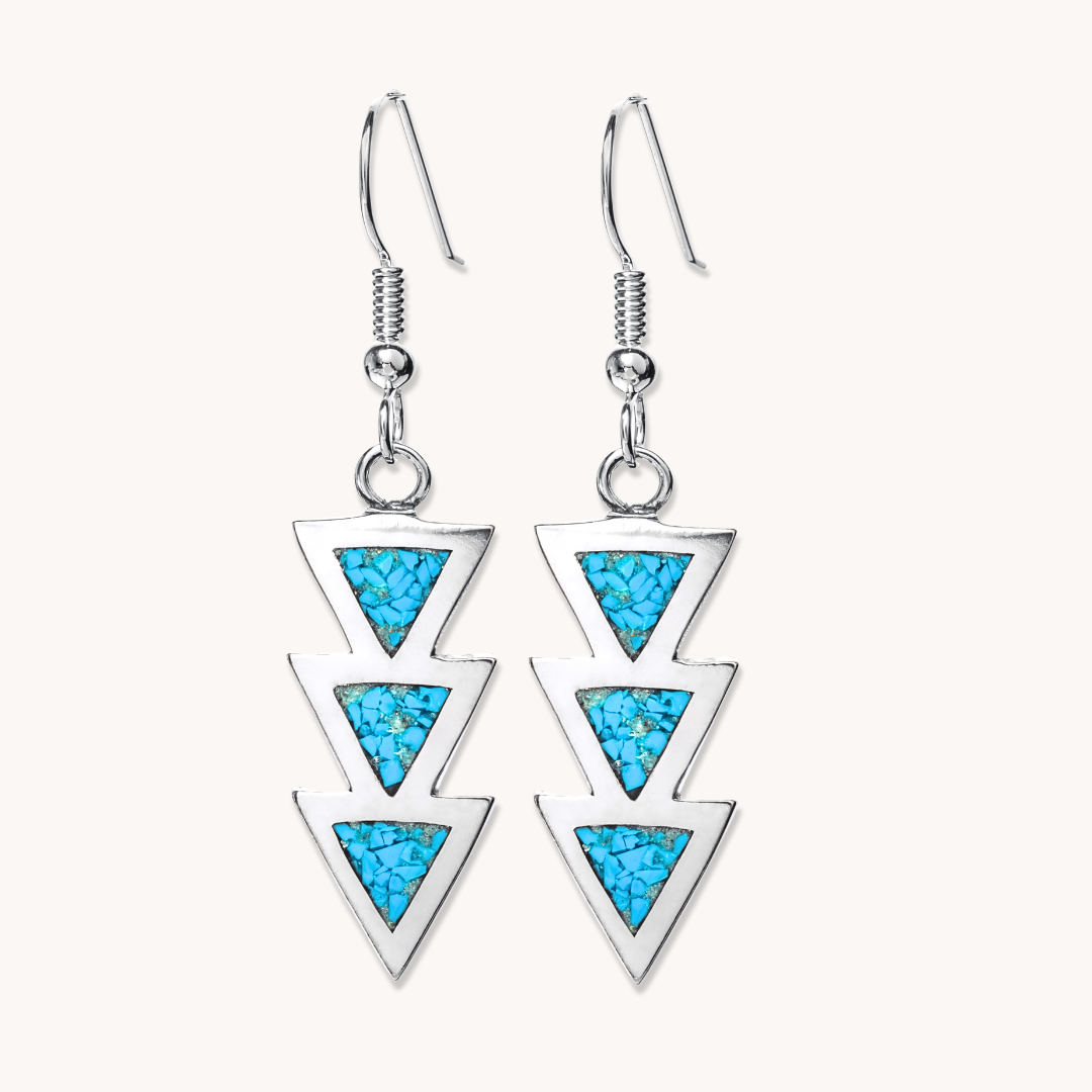 The Azteca Turquoise Drop Earrings pay homage to the universal significance of triangles. In Aztec culture, triangles symbolize the strength and unwavering nature associated with mountains. These earrings showcase a captivating geometric design, skillfully crafted from sterling silver and meticulously set with turquoise inlay.