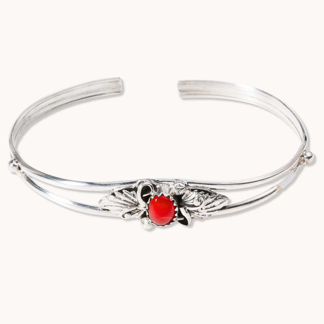 This handcrafted sterling silver bracelet showcases authentic red coral set within intricate filigree work and feather motifs. The warm coral tones complement the lustrous silver, creating visual depth and sophistication. Ideal for layering or wearing solo, this cuff adapts effortlessly to your daily wardrobe while maintaining the distinctive character of a carefully curated accessory.