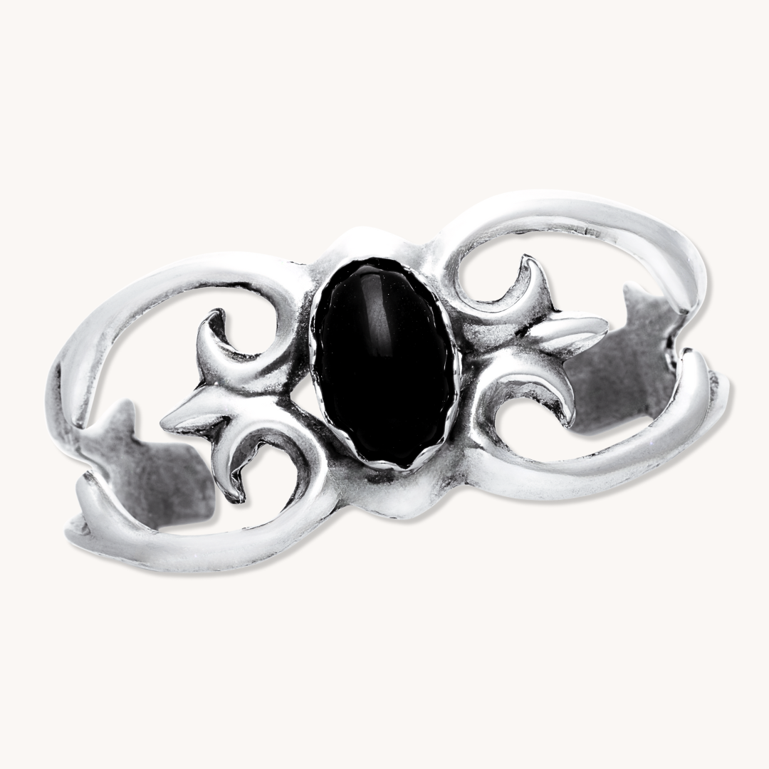At the center sits a striking Black Onyx stone—long revered for its deep, mirror-like black and timeless elegance. The stone is framed by flowing, hand-finished scrollwork inspired by classic Southwestern design, creating a piece that feels both rooted in tradition and unmistakably modern.