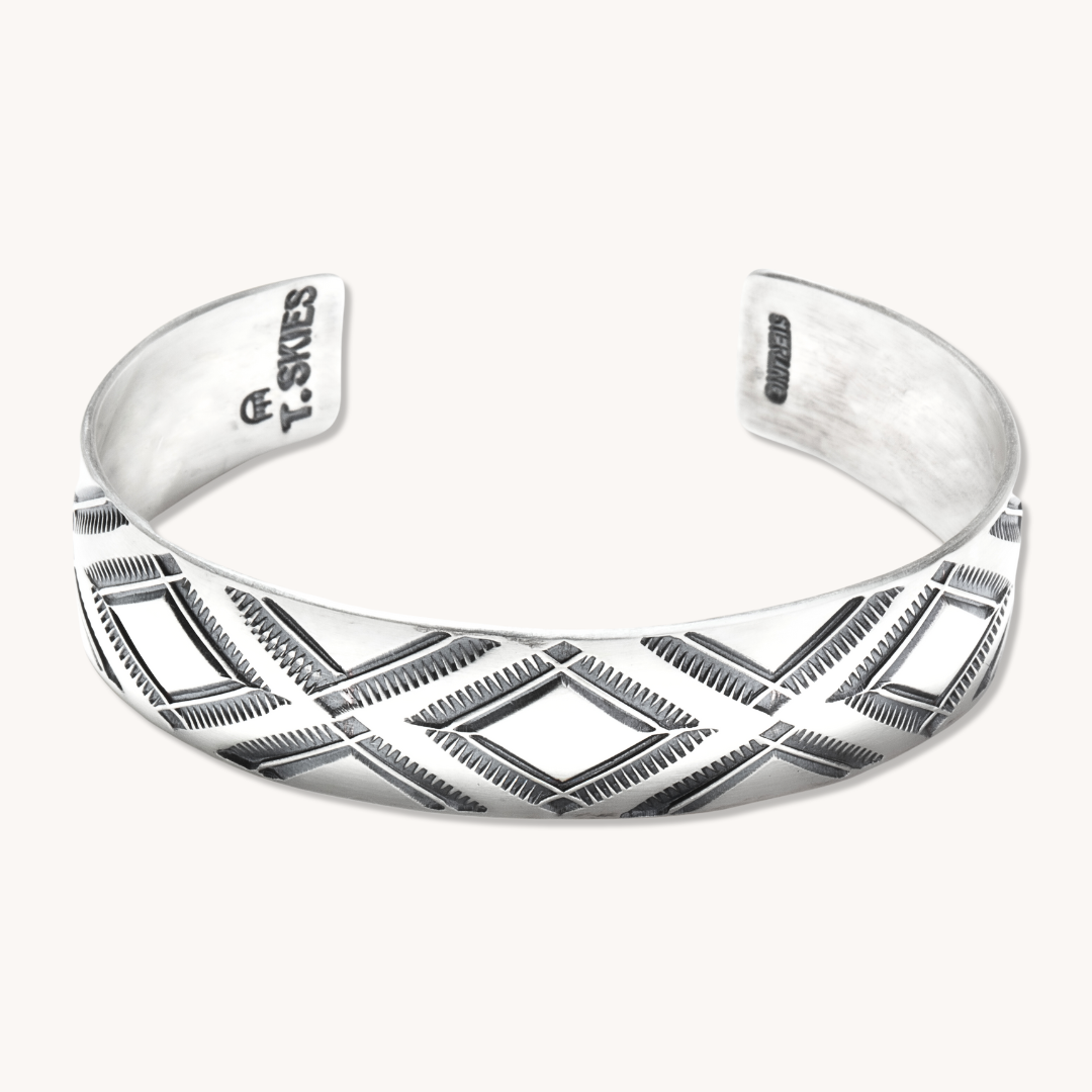 This Bead Maiden bracelet is the lucky green bracelet your wardrobe has been waiting for. T.Skies artist Diego Cruz was inspired by the four-leaf clover in this design. The pattern features segments of lucky seven beads in turquoise and silver, to bring a touch of fortune to every wearer. The design features our sterling silver Desert Pearls, natural turquoise nuggets, and white coral beads as the perfect finishing touch.