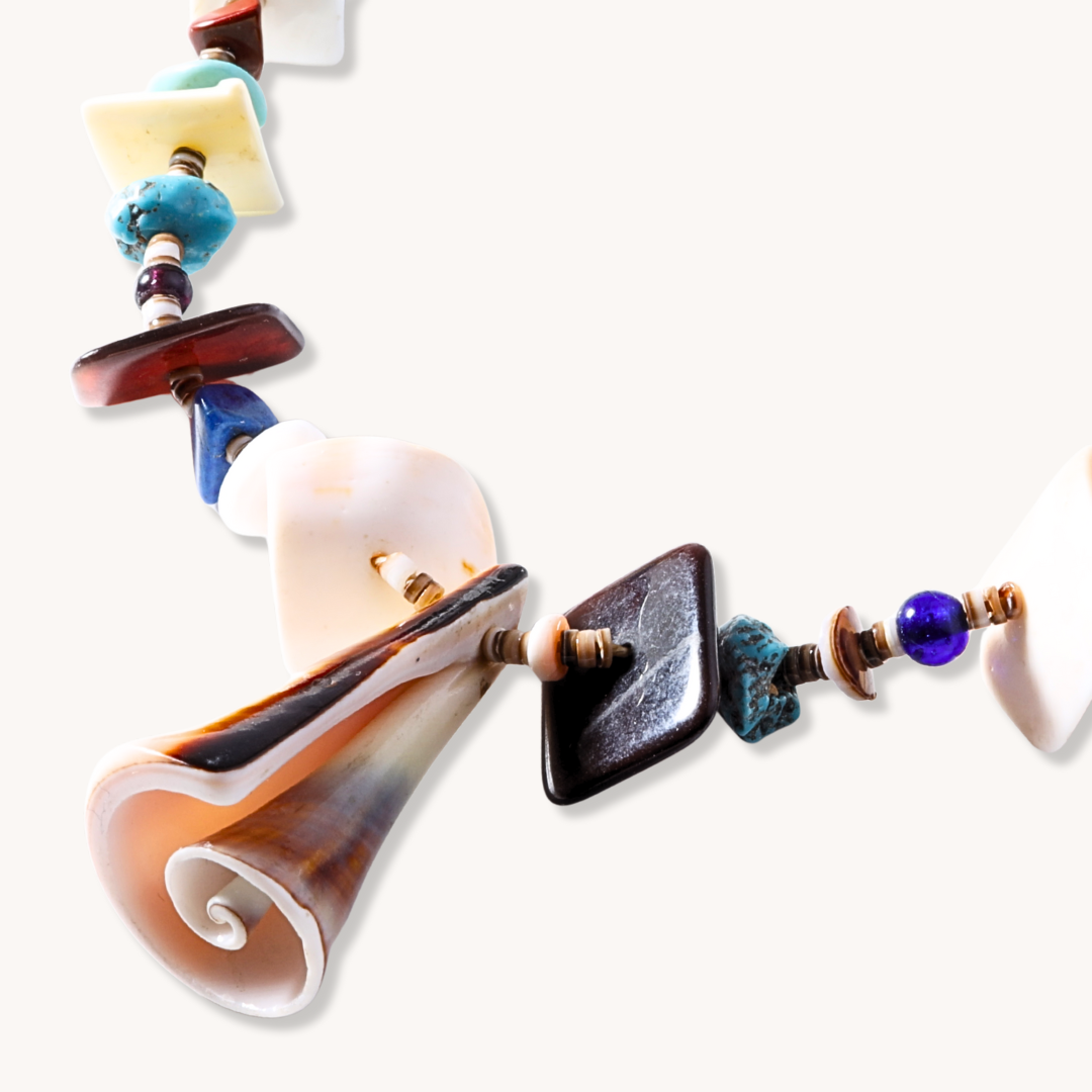 This Multi-stone and Shell Heishi Necklace features lapis, pinshell, melon shell, and Turquoise stones, offering a unique variety with an easy-to-use hook clasp.