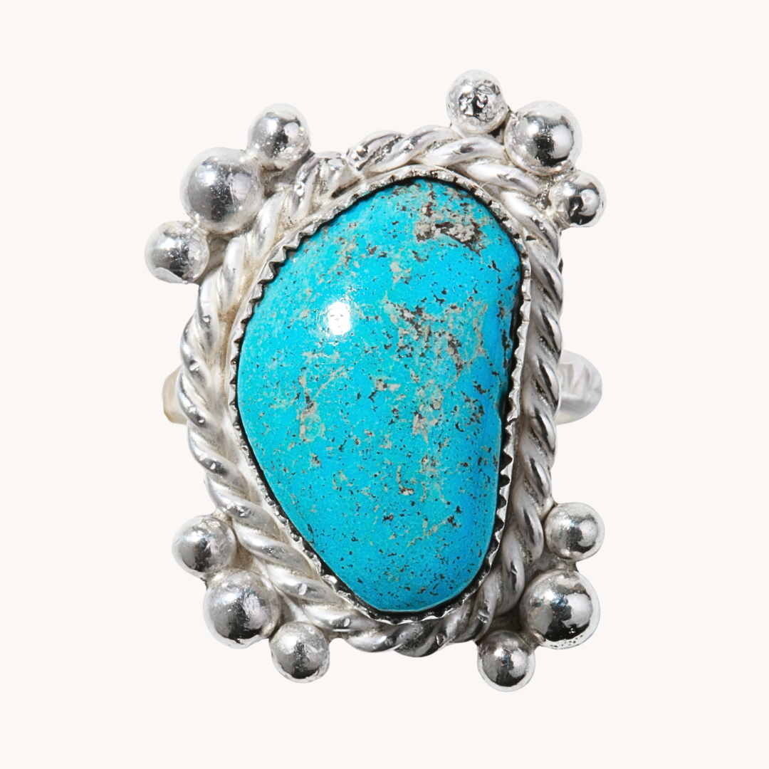 Elevate your everyday style with our Two-Stone Turquoise Rings with Silver Bead Accents. These handcrafted sterling silver rings feature natural turquoise stones and delicate silver bead accents, making them the perfect statement piece for any occasion. Make a stylish statement with these unique and expertly crafted rings.