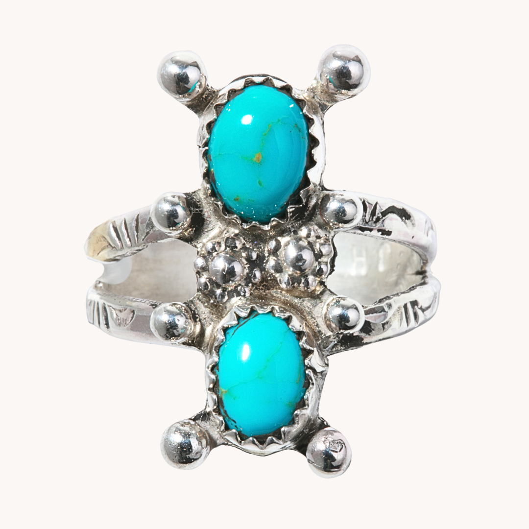 This unique Vintage Turquoise Ring with Silver Wire Accents is a fun and funky addition to your everyday wardrobe. Made with sterling silver and natural turquoise, this vintage ring exudes effortless style and can be worn for any occasion. Elevate your look with this timeless and versatile piece.