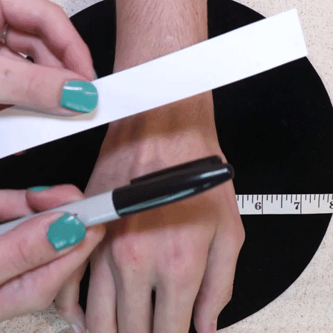 If you don't have flexible measuring tape, simply wrap a piece of paper around your wrist and mark where the paper meets. Lay the paper down next to your ruler, and make note of the length in inches.