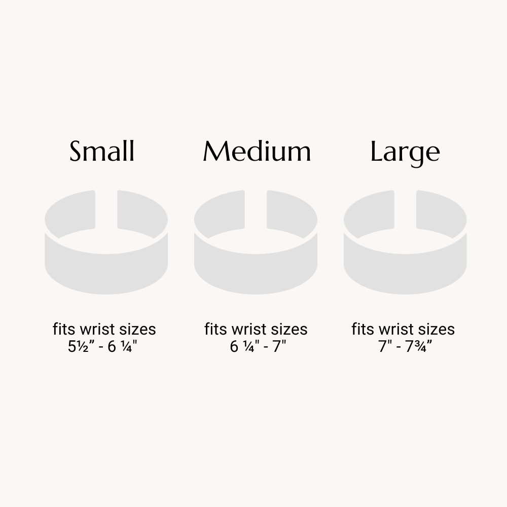 Now that you know your wrist size, you can find the perfect bracelet size using the T.Skies sizing chart. Every T.Skies cuff bracelet is adjustable with 1" to 1.-5" gaps so that you can adjust to the perfect fit!