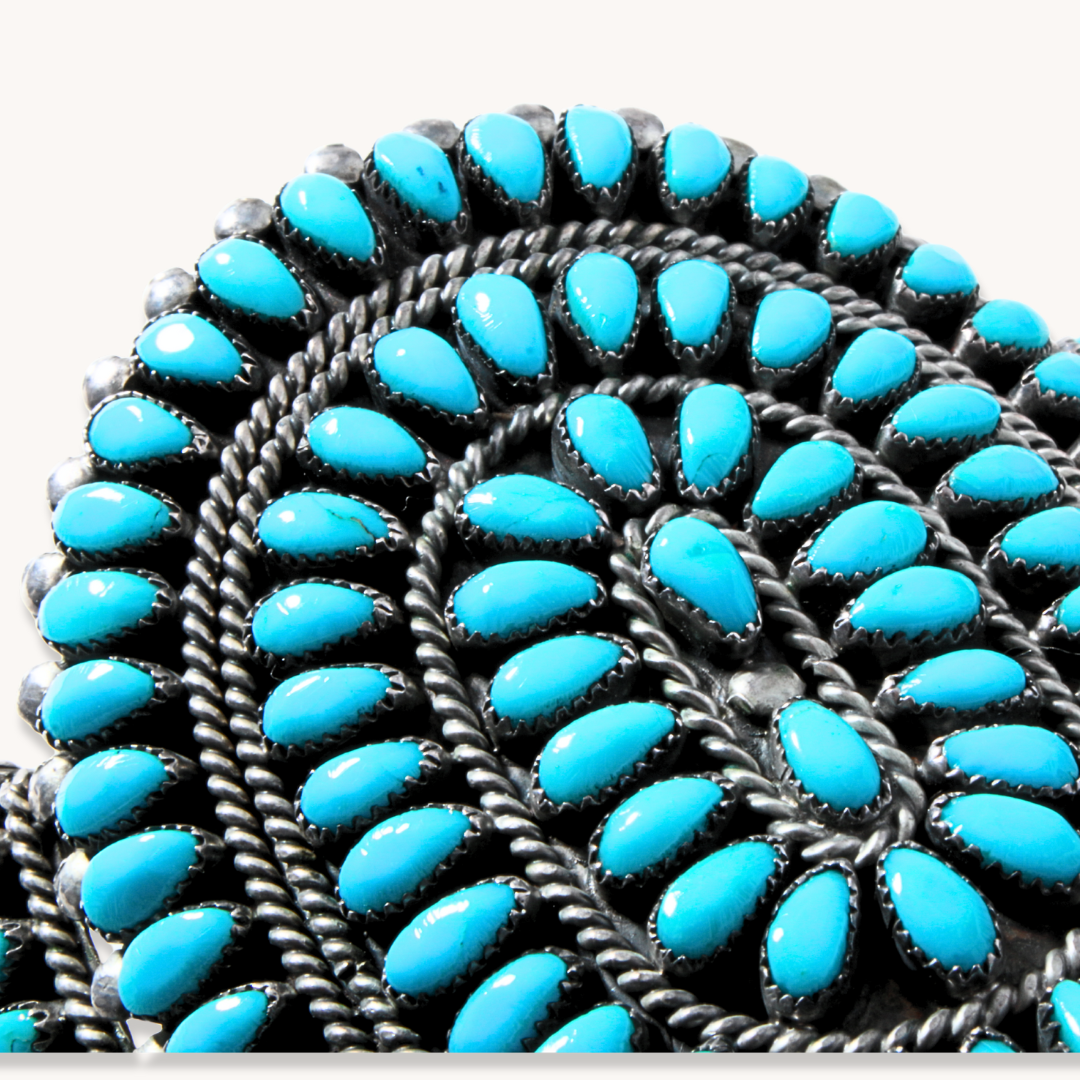 This stunning cuff bracelet features over one hundred natural turquoise stones meticulously set in sterling silver, creating a bold and captivating design. Each piece is handcrafted with exceptional attention to detail, making it truly one of a kind. The turquoise stones showcase their natural variations in color and pattern, adding authentic character and charm. Perfect for making a statement, this bracelet combines artisanal craftsmanship with the timeless beauty of genuine turquoise and precious metal.