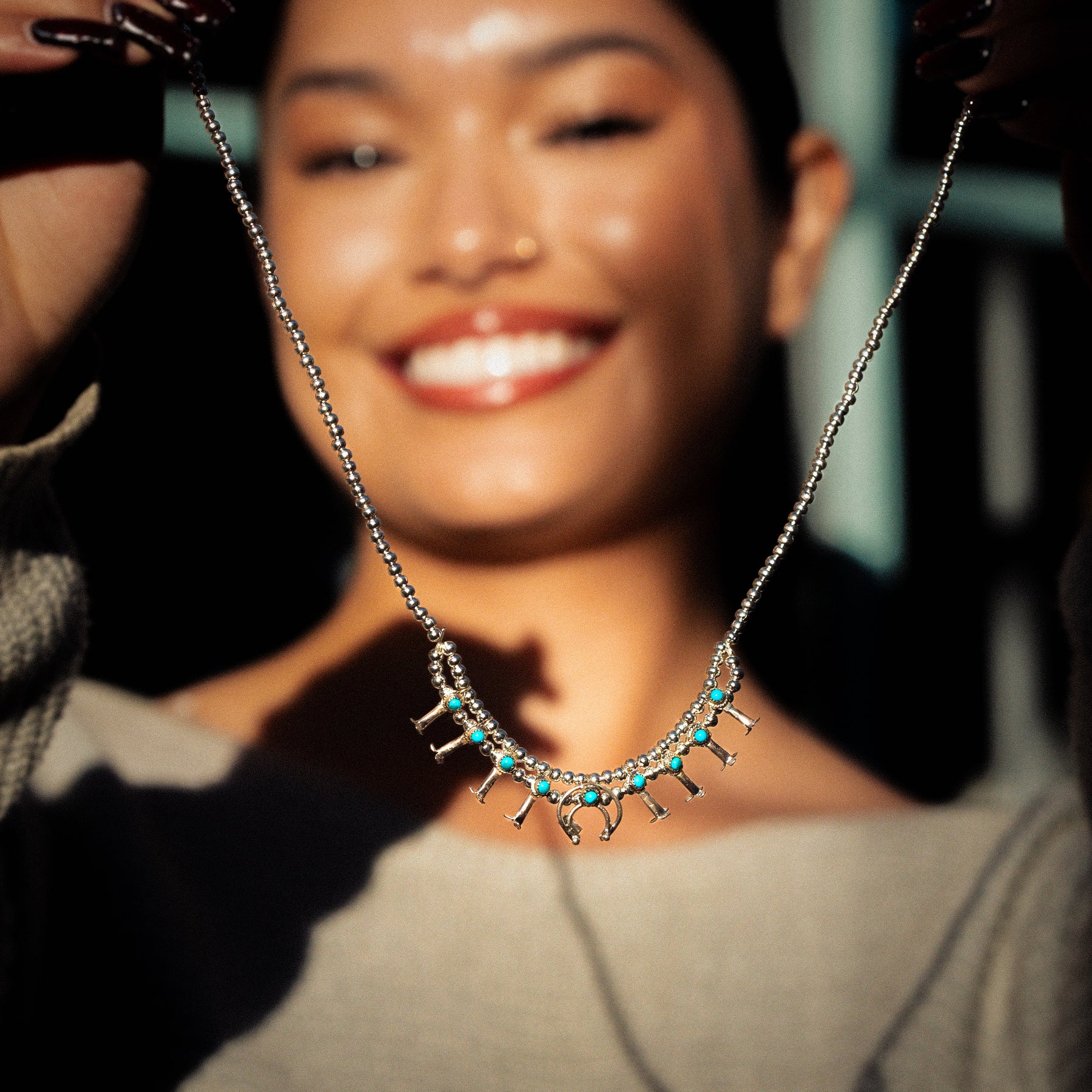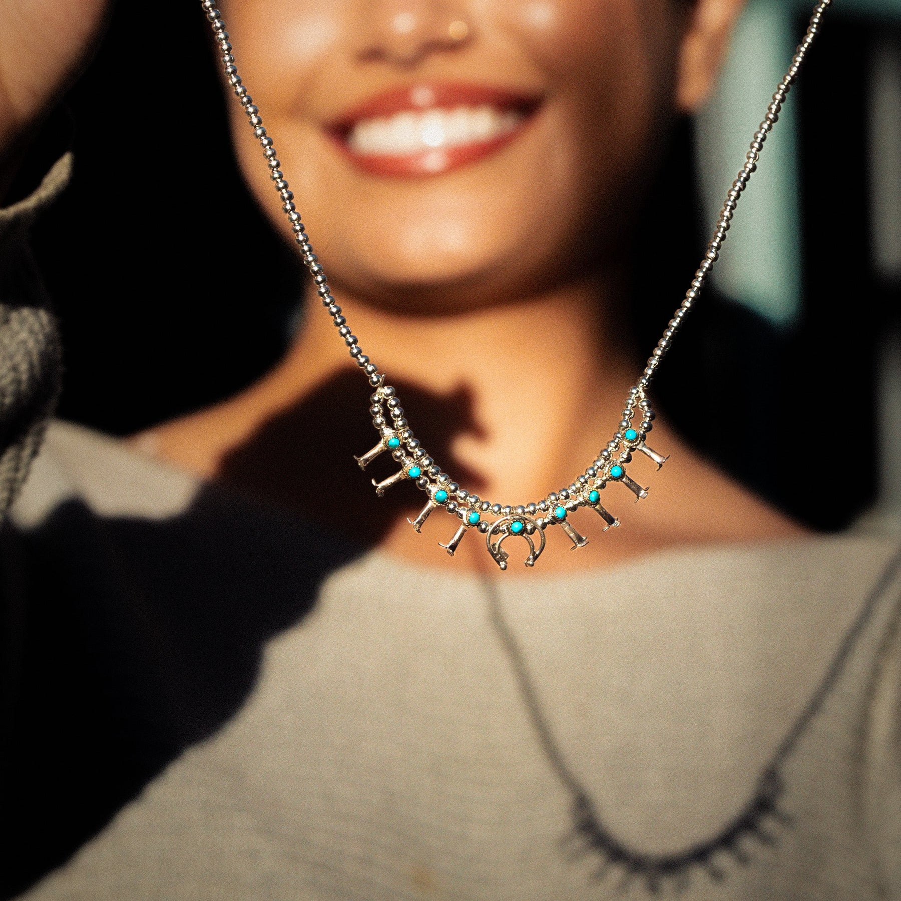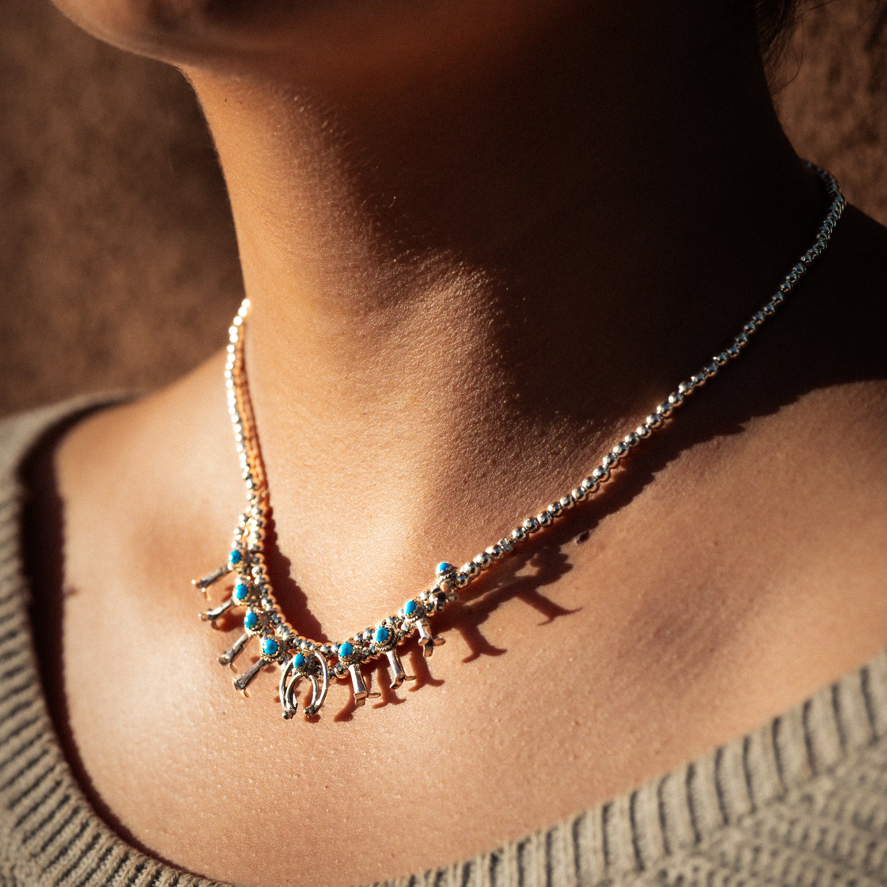 This handcrafted micro squash blossom necklace combines sterling silver construction with authentic natural turquoise, honoring a revered Southwestern jewelry tradition. The refined proportions and careful attention to detail reflect expert artisanal work. An investment piece for discerning collectors who value authentic materials and timeless cultural craftsmanship.